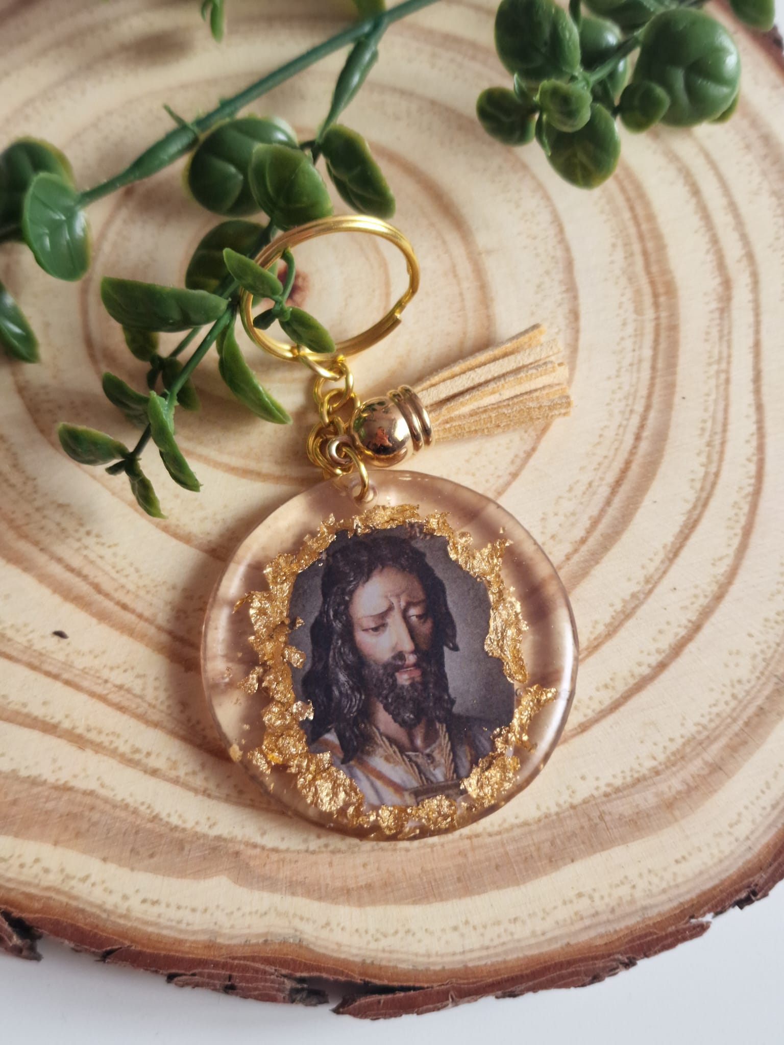 Descubre este exclusivo llavero de Nuestro Padre Jesús Cautivo, una pieza artesanal única creada a mano con resina de alta calidad y delicados detalles en pan de oro.