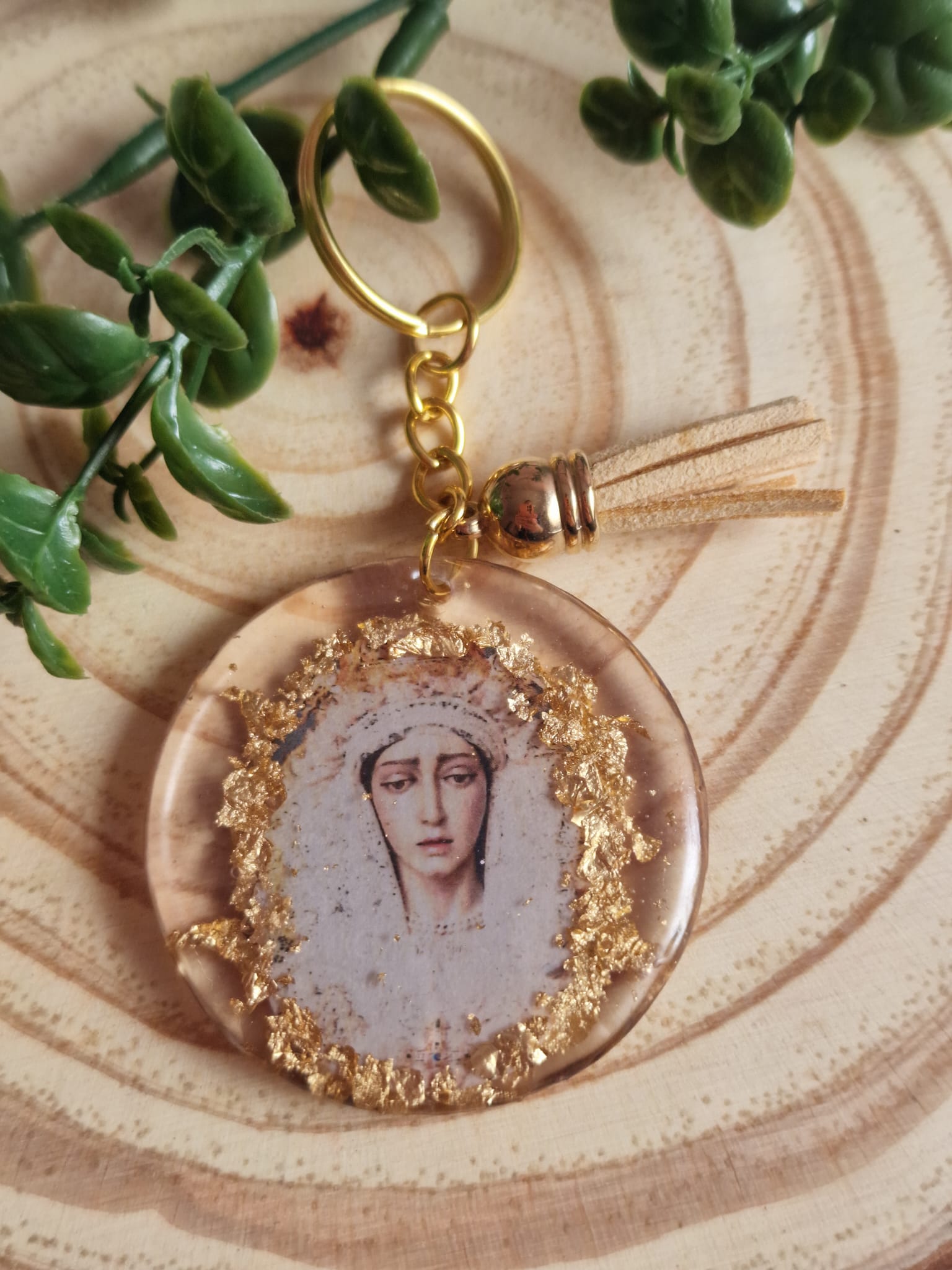 ✨ Descubre este exclusivo llavero artesanal de María Santísima de la Salud de Estepona, hecho completamente a mano en resina de alta calidad y decorado con delicados detalles en pan de oro.