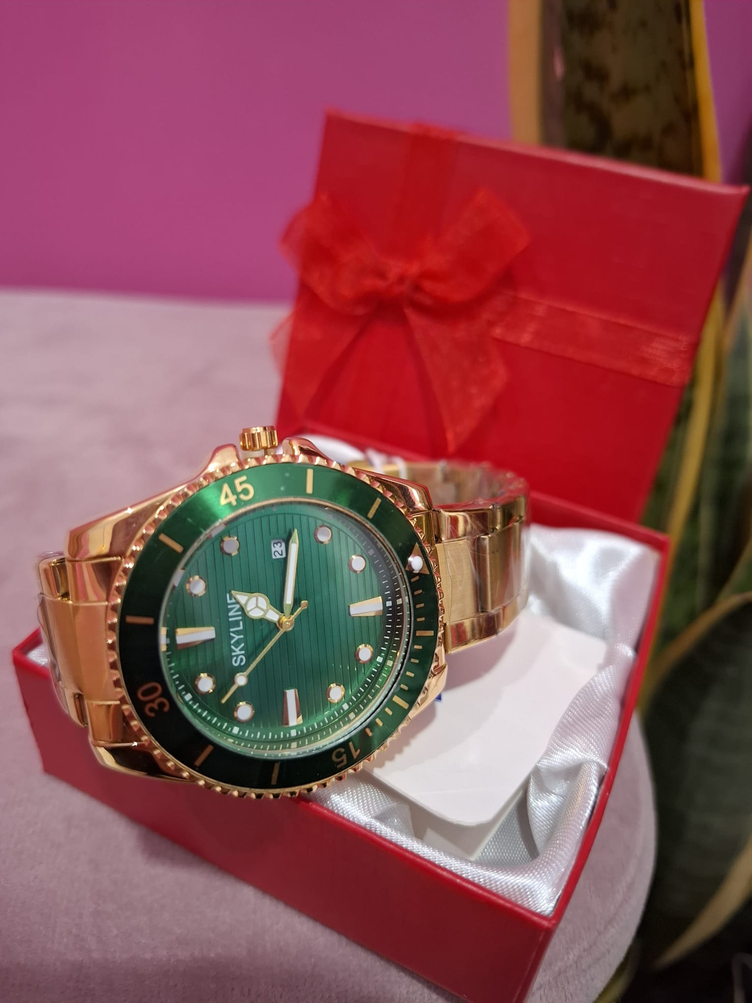 Reloj de hombre sumergible con un diseño en color dorado que irradia elegancia, complementado por una caratula verde esmeralda que añade un toque distintivo y sofisticado. Resistente al agua, este accesorio combina estilo y funcionalidad, ideal para hombres modernos que buscan destacar en cualquier ocasion.